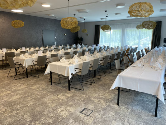 Der Raum ist lichtdurchflutet und bietet einen wunderschönen Ausblick die Weinberge. An den Veranstaltungsraum schließt sich eine Pausenzone an, in welcher Sie gemütlich Ihren Kaffee trinken